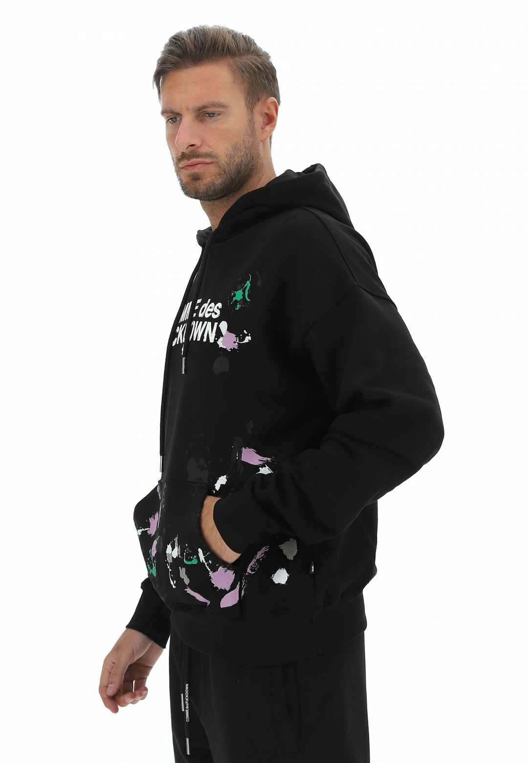 - Altre caratteristiche: cappuccio con coulisse regolabile, tasca a marsupio e stampa a contrasto sul fronte